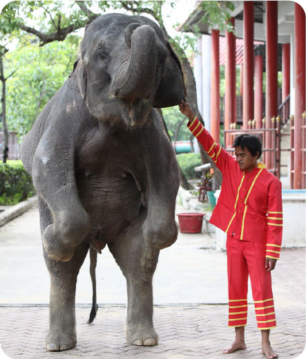 Из больших ворот выходила небольшая молодая слониха с молодым тайцем. Дрессировщик улыбался нам и махал рукой. Мы подошли поближе. Тогда он сделал быстрое движение, слониха встала на задние ноги. Продолжая улыбаться, дрессировщик поманил мою супругу, а мне показал на камеру, предлагая запечатлеть эту встречу. Когда моя спутница запрыгала от радости, я не смог удержаться и протянул дрессировщику зеленую купюру. Он жестом показал, что работает слониха, поэтому вознаграждение полагается ей. Тогда я протянул деньги «артистке». Та хоботом аккуратно взяла бумажку, поднесла к глазам, удовлетворенно закивала и передала дрессировщику.