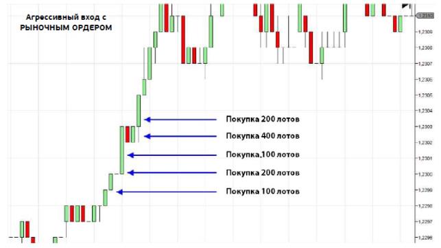 Поскольку ваша позиция довольно большая, она не будет заполнена вся сразу. Она заполнится быстро, вы сможете войти в позицию целиком, но позиция будет разделена при быстром движении цены вверх. Это агрессивные участники рынка, которые своими рыночными ордерами агрессивно двигают цену вверх или вниз. Это истинная причина, по которой происходит движение цены.