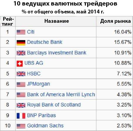 Таблица справа показывает, что примерно 80% всего объема валютных операций совершается всего десятью финансовыми орагнизациями. У них абсолютное большинство, они двигают и манипулируют ценой. Это их игра!