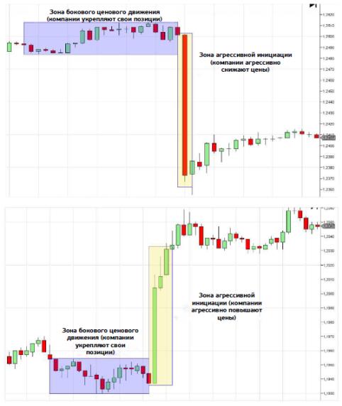 Агрессивная активность инициации – это, по сути, значительное движение цены или тренд. Она вызывается агрессивными покупателями, толкающими цену выше, или агрессивными продавцами, толкающими цену ниже. Такого рода агрессивные покупки или продажи часто происходят после бокового ценового движения. Происходит это так: крупные компании наращивают свои позиции (в боковых областях), а когда они заканчивают с этим, они начинают агрессивную покупку или продажу, чтобы манипулировать ценой и двигать ее в любом направлении. Так они зарабатывают деньги. Они наращивают свои позиции медленно и незаметно, а затем начинают тренд, чтобы сделать эти позиции прибыльными.