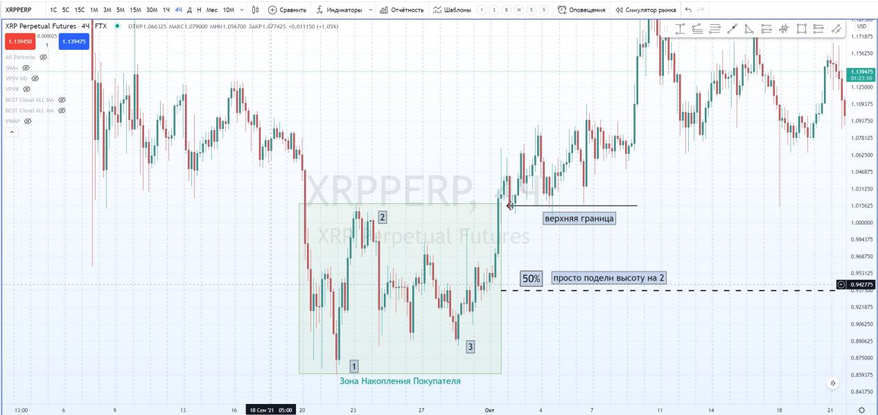 Запомните! Цена всегда будет ударять либо в верхнюю границу накопления, либо в 50% и лишь иногда в нижнюю или верхнюю.