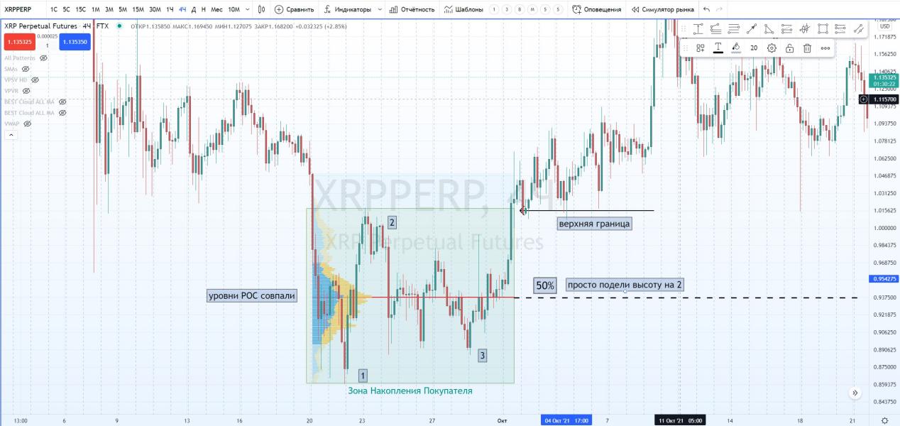 Нужно просто растянуть Профиль Фиксированного Объема на границы накопления и посмотреть где уровень макс. Объема. И если он не совпадает с уровнем 50%, то эти уровни нужно совместить в одну зону сопротивления или поддержки.