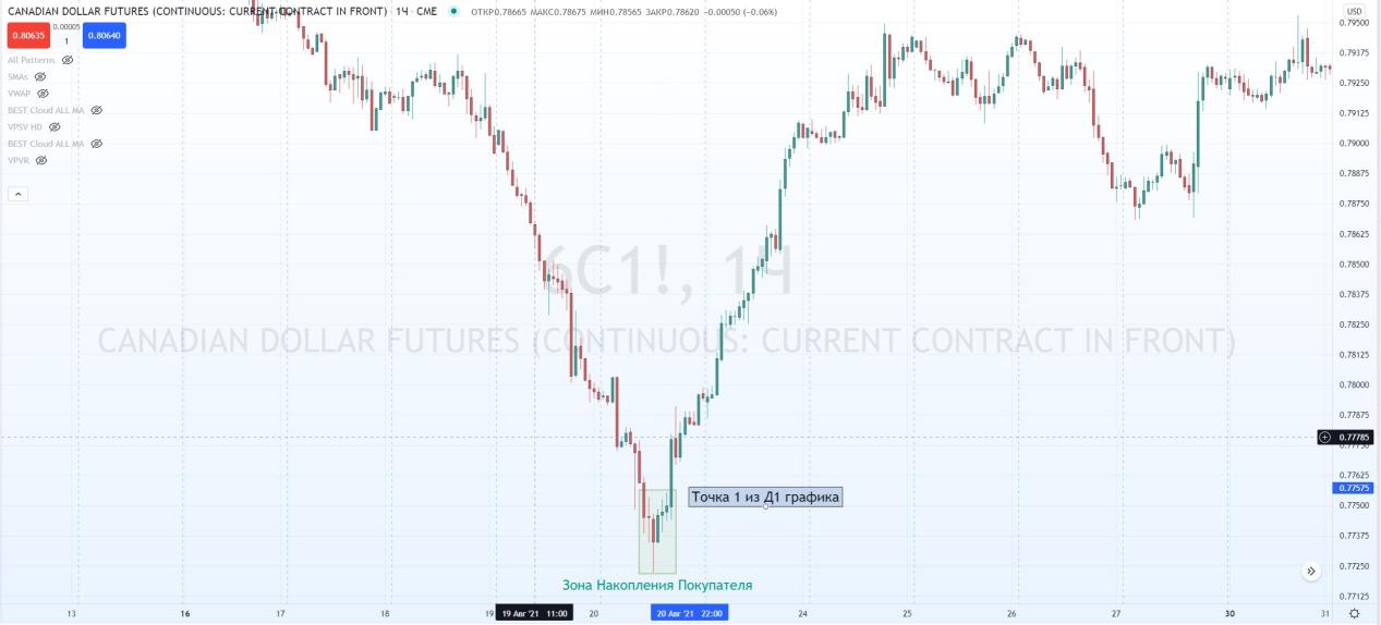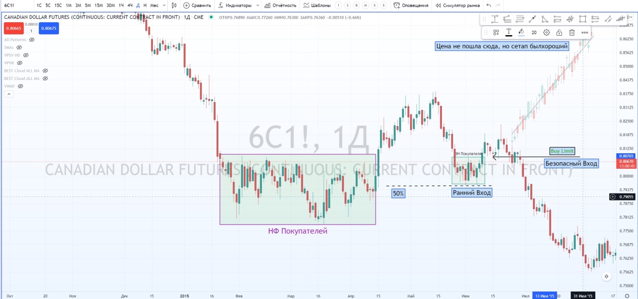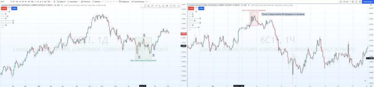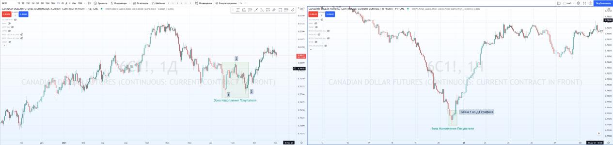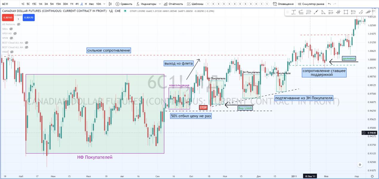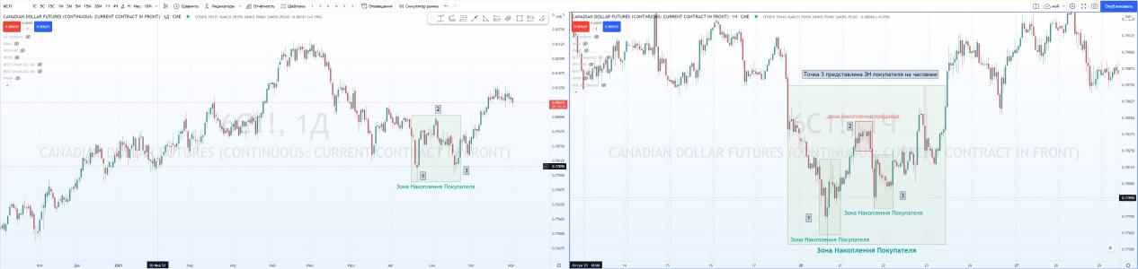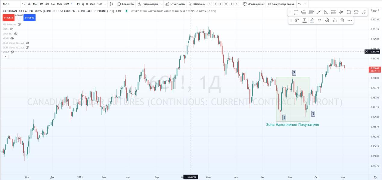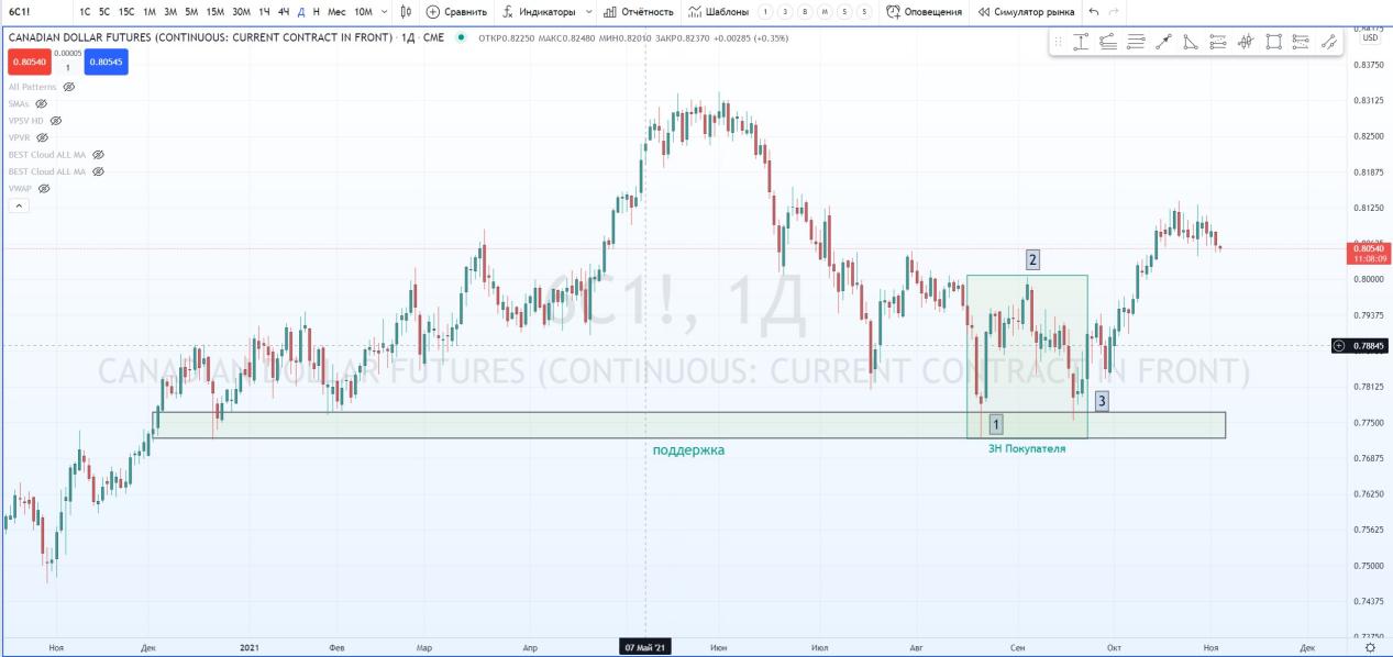 На графике фьючерса на канадский доллар Д1. Я успешно нашел ЗНП и отметил паттерн 1-2-3.