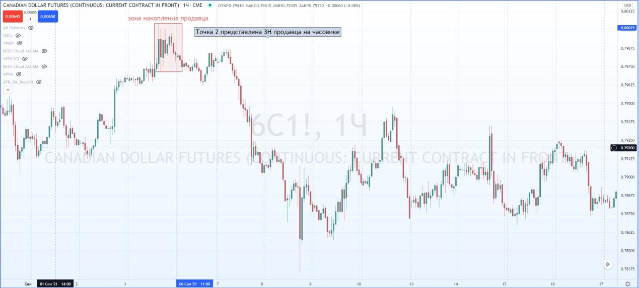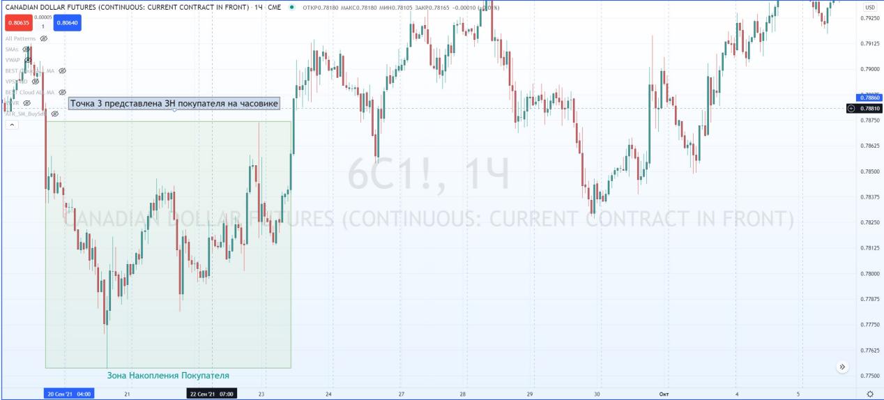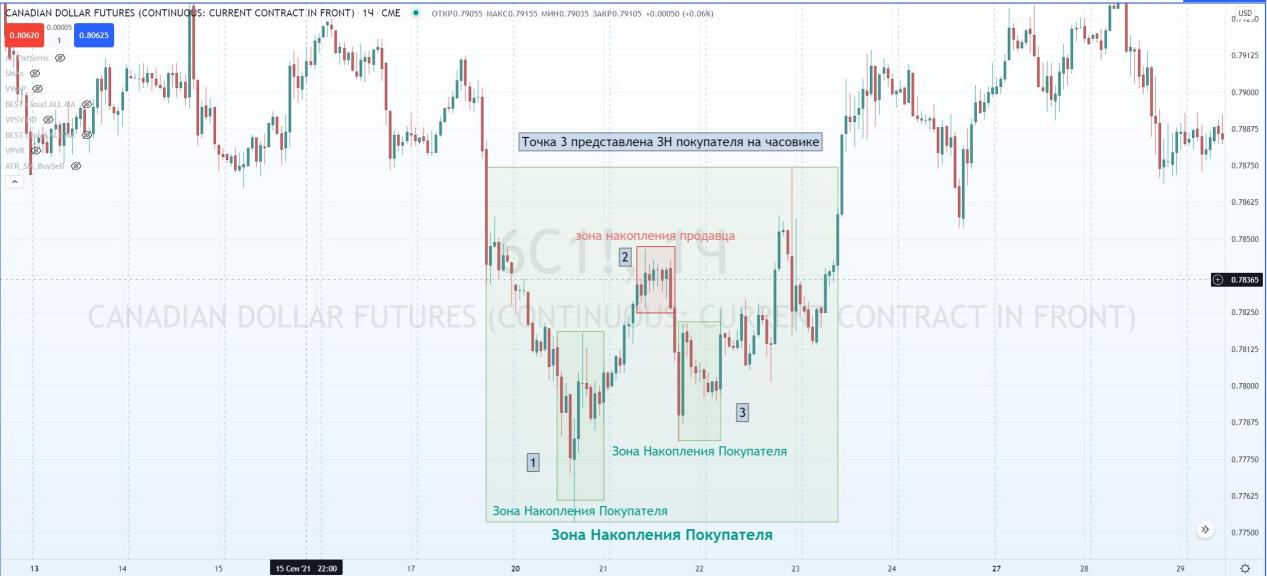 Та же самая Точка 3, которую разбирали выше, состоит, если всмотреться, из ЗНПок. и ЗНПр или паттерна 1-2-3!!! И все это прямо внутри ЗНПок. старшего таймфрейма.