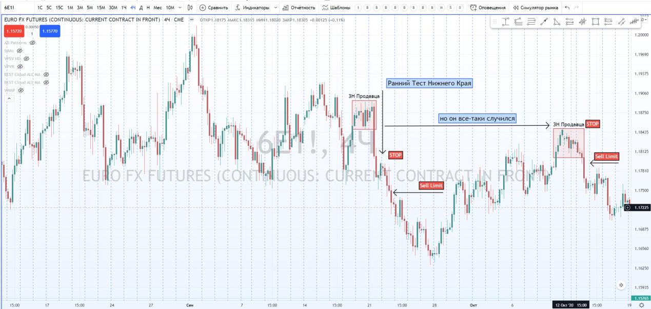 Вот отличный пример. Можно было отлично заработать, выставив селл-приказ после теста нижнего края ЗН Продавцов. А потом взять еще прибыль, выполнив Ранний Вход.
