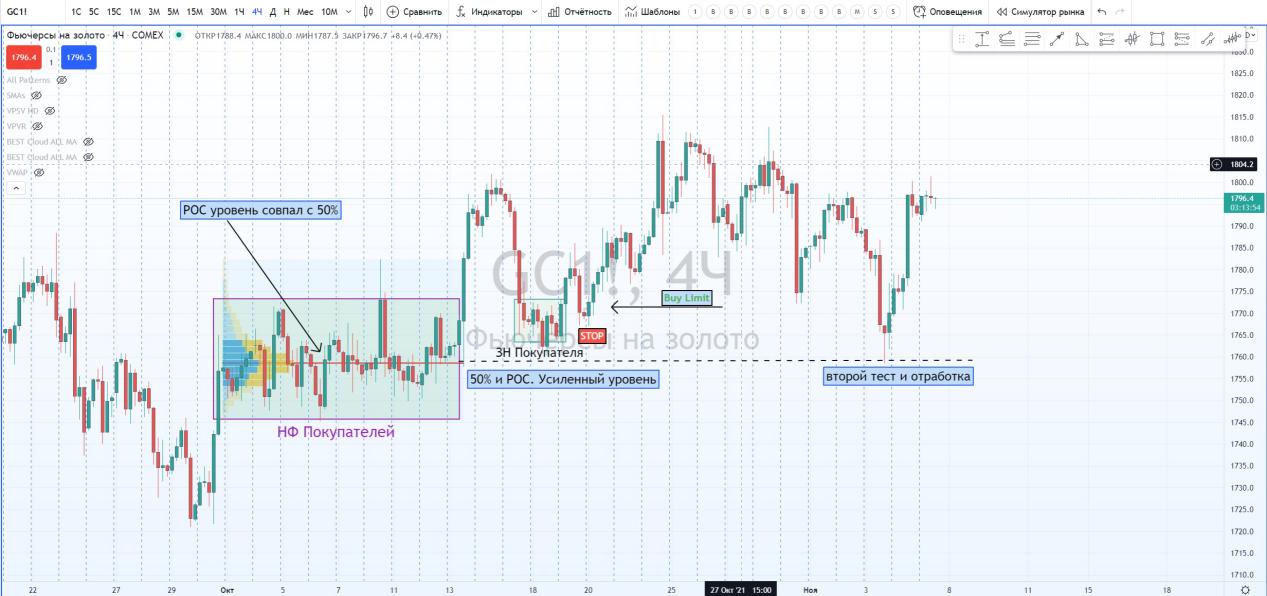 Смотрите. Я просто обозначил наши любимые ЗН Покупателя и 50% уровень. И стал ждать его теста.
