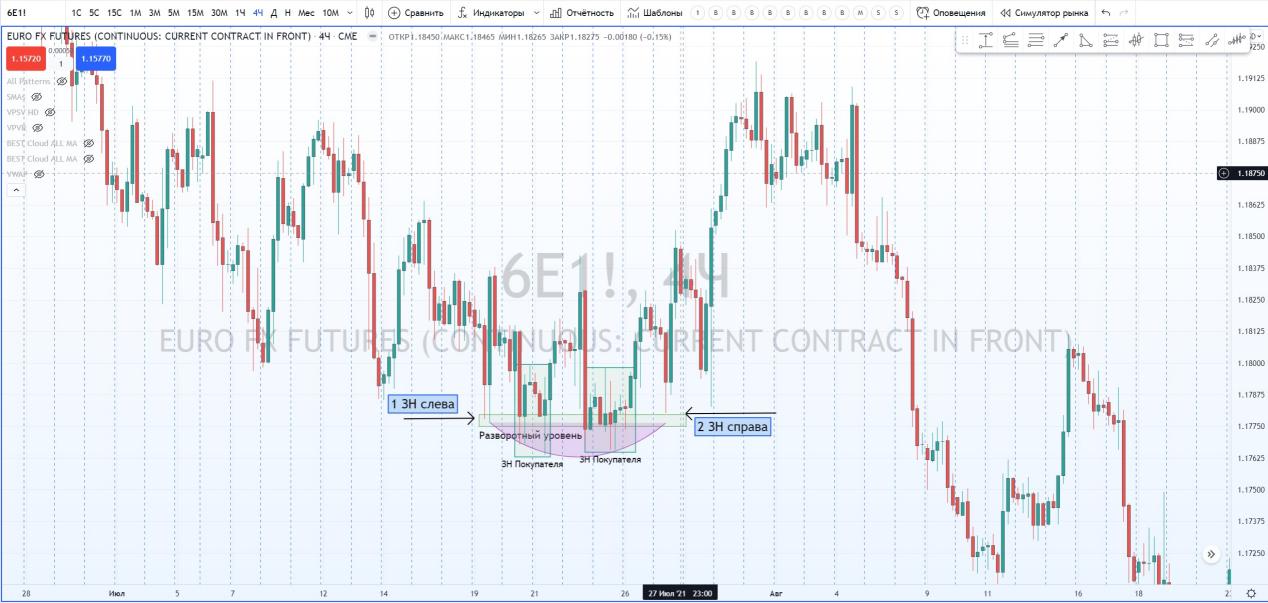 Разворотный Уровень Покупателя. Состоит из двух ЗН Покупателя, формирующих поддержку и напоминающих овал, а также двух хвостов слева и справа от этой зоны, тестирующих поддержку. Если перейти на более мелкий таймфрейм, то можно обнаружить ЗН покупателя.
