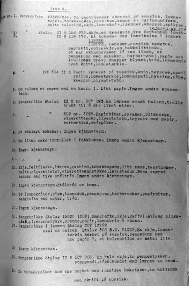 Единственное, что удалось найти констеблю Сигмунду Лей-гланду из Квесменеса в Лингене у погибших в Китдалене, это медальоны с указанием номера заключенного, они были у большинства из 104 жертв, найденных в большой могиле (могила № 1). Он присутствовал в июне 1945 года при судебно-медицинской экспертизе погибших и сохранил личные вещи, такие как медальоны с номером заключенного и бумаги. Насколько это было возможно, он пытался распознать знаки, татуировки и русские слова с помощью переводчика. Работа шла с большим трудом, так как бумага часто оказывалась настолько истлевшей, что совершенно нельзя было понять, что там написано. Лейгланд также сохранил одежду, найденную в могиле № 4, пропитанную, по его мнению, бензином64. Профессор Эйнар Шьовалл и его ассистент Магне Свендсен проделали нелегкую работу по исследованию останков 143 советских жертв из четырех могил в Квесменесе в Лингене спустя некоторое время после освобождения. В ходе этих исследований обнаружилось, какому жестокому обращению подвергались советские военнопленные. Английские и американские офицеры, принимавшие участие в этой операции, свидетельствовали после окончания работ, что они только слышали о таких преступлениях, но не верили, что это могло здесь произойти. В первой, самой большой могиле останки нашли на глубине 1,5 метров, головы были надежно прикрыты большими вязанками прутьев. Трупы забросали камнями и землей, а саму могилу прикрыли дерном65. В этой первой могиле нашли 96 человек. 79 из них умерли от голода, а 17 либо расстреляны, либо забиты до смерти. Большинство расстрелянных были убиты одним выстрелом. Стреляли в затылок, в висок, в шею или грудь, был один убитый выстрелом в спину и один убитый выстрелом в живот. Как правило, стреляли в упор, повреждения у жертв были настолько обширными, что позволяло с уверенностью предположить, что расстреливали из автоматов. У одного из расстрелянных головной убор был натянут на глаза, что позволяло предположить, что он был казнен. В другой могиле, где было найдено 12 человек, также присутствовали жертвы казни с натянутыми на глаза головными уборами. Один из найденных был убит выстрелом через левую руку и затем в голову через правую щеку. Похоже, что он заметил направленное на него оружие и попытался защитить голову рукой. Все жертвы из второй могилы погибли насильственной смертью. Теплая одежда свидетельствует о том, что все они работали на улице, дальнейшие исследования показали, что все они погибли вскоре после того, как оказались в лагере. В третьей могиле нашли двух человек. Врачи отметили, что один из них был похоронен в земле, другой лежал на земле под снегом. Один из погибших был полностью одет и убит двумя выстрелами в упор. Головной убор надет задом наперед и надвинут на глаза. Грудь раскрыта. В данном случае все указывало на совершение казни. Другой погибший также был расстрелян, но следов казни не обнаружено. Его застрелили в затылок, пуля прошла через голову. Из-за обширных повреждений эксперты заключили, что выстрел произведен из автомата. Вероятно, пленного оставили силы по пути на работу в горах, и он не мог держать темп колонны, поэтому немецкие конвоиры его застрелили. Эти смерти случились не одновременно, несмотря на то что оба были расстреляны и находились в лагере в одно и то же время. В четвертой могиле нашли 