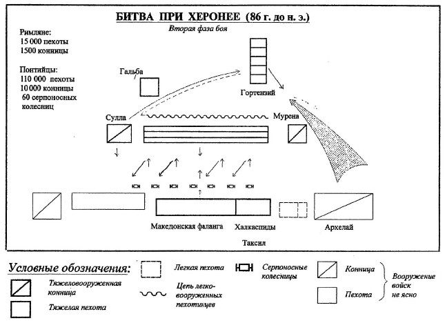 О ходе самого боя Фронтин пишет: «Сулла распорядился крепко вбить в землю многочисленные колья и внутри них, когда приблизились квадриги, укрыл линию антесигнанов, и только тогда, приказав всем кричать, повелел велитам и легковооруженным пустить снаряды. Когда это было сделано, квадриги врагов, или наткнувшись на частокол, или испугавшись крика и снарядов, повернули на своих и расстроили построение македонян». В общем, сначала последовала атака колесниц, которые, как и предполагалось, частично напоролись на колья, а частично были закиданы метательными снарядами велитов (?)158 и легковооруженных, прошедших через промежутки между когортами. Часть же коней была испугана криками. После чего повернувшие упряжки расстроили свою же фалангу. Далее Сулла атаковал. Архелай попытался, сдержать противника, послав в атаку конницу, но римляне контратаковали ее своими малочисленными всадниками (sic!) и победили.