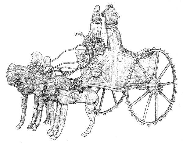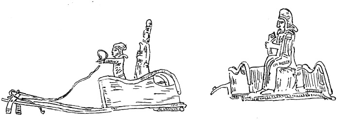 Золотая модель колесницы из Аму-Дарьинского клада (V в. до н. э.). Типичная ездовая квадрига ахеменидского времени, с характерными большими колесами. Знатная персона сидит в кузова. Система тяги представлена двумя дышлами и одним ярмом-брусом. Как отметил еще Ормонд Дальтон (1886–1945), на фронте колесницы показана голова египетского бога Беса (.Dalton О. М. Treasure of the Oxus with Objects from Ancient Persia and India. London, 1905. P. 78–79). На дышле закреплены своеобразные полукруглые штандарты.