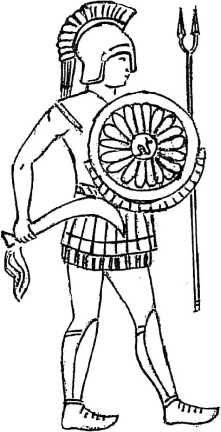 Тяжеловооруженный воин. Рельеф из Коньи с ликийской надписью (примерно V в. до н. э.). Воин носит типичное анатолийское (греко-малоазийской) вооружение, типичный аттический шлем, панцирь с птеригами – греческие элементы; небольшой щит, поножи с башмаками, двухконечное копье, серп – восточные элемент.