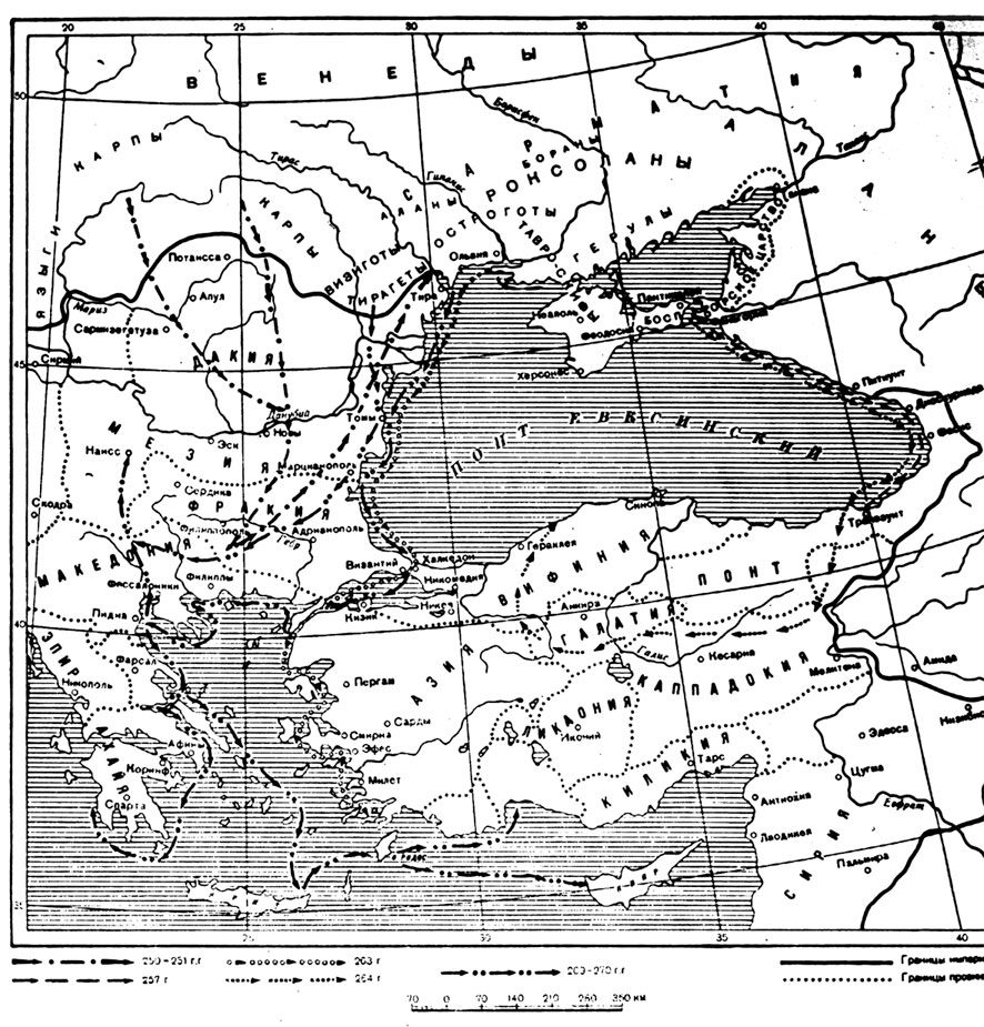263 г. – поход готов вдоль западного побережья Черного моря, переправа с Балкан в Малую Азию, разрушение Халкедона, Трои, разграбление Эфеса, переправа обратно во Фракию и ее разграбление; возвращение домой[33].