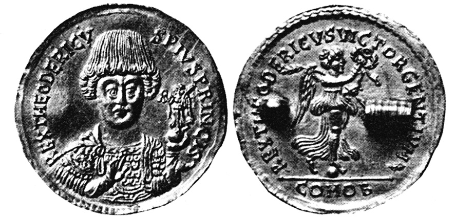 Золотой юбилейный медальон Теодориха Великого, отчеканенный в Риме около 507 г. На аверсе показан сам король в имперском панцире и плаще, держащий державу с Викторией; надпись гласит: Rex Theodericus Pius princis (= princeps invictus semper или princeps invictus/ invinctissimus). На реверсе показана опять же Виктория и надпись: Rex Theodericus Victor gentium. Медальон был переделан в фибулу. Воспроизведено по: Göbl R. Antike Numismatik. Bd. II. München, 1978: 226–227. Taf. 126. 2679.