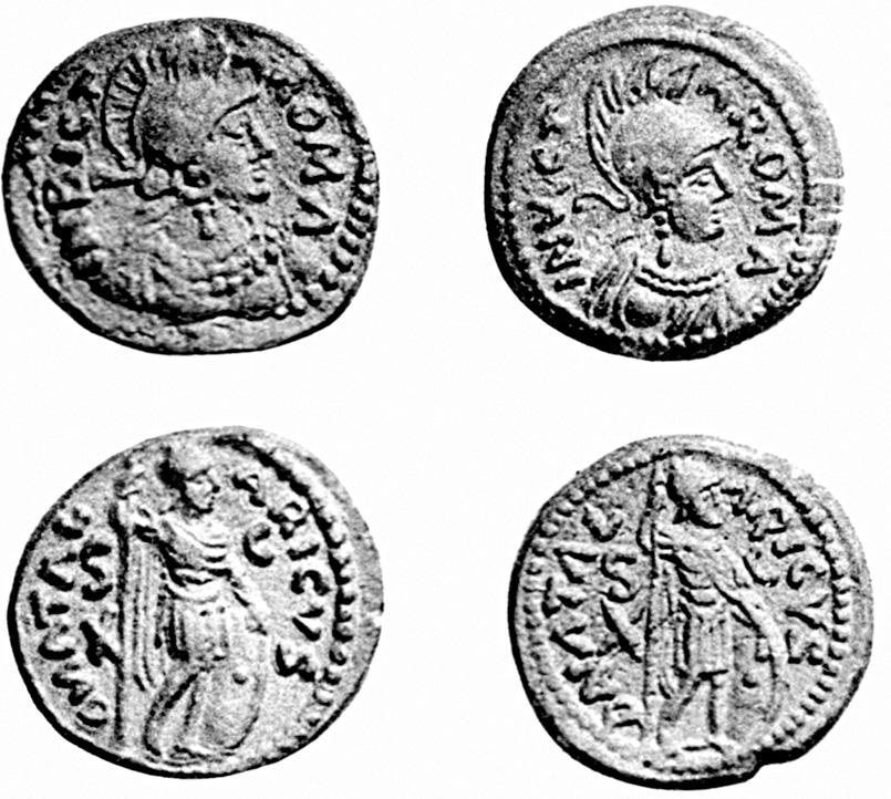 Бронзовые монеты остроготского короля Аталариха (526–534 гг.) достоинством 10 нуммов, отчеканенная в Риме. Аверс: бюст Ромы в шлеме, реверс: Аталарих в шлеме, кирасе и плаще, держащий копье и овальный щит. Воспроизведено по: Wroth 1911: 69. Pl. VIII,21–22.