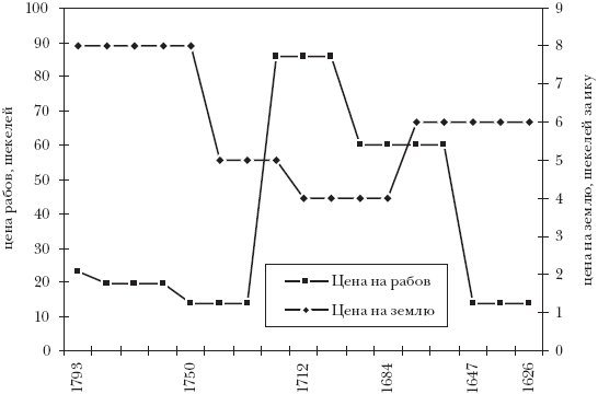 Американский исследователь Х. Фарбер посвятил обстоятельное исследование вопросу о динамике цен в XVIII – XVII вв. до н. э.[288]. Наиболее подробная информация имеется о ценах на рабов и участки земли. На рис. 2 мы совместили два графика, приводимых Х. Фарбером и отражающих динамику этих величин[289]. Цены на рабов характеризуют стоимость рабочей силы и в экономической теории ведут себя так же, как реальная зарплата, т. е. с ростом численности населения цены на рабов уменьшаются, а с сокращением населения – увеличиваются. Цена на землю жестко связана с земельной рентой, и при увеличении численности населения она, как и рента, возрастает, а при уменьшении – убывает. Таким образом, на графике представлена динамика двух составляющих экономического процесса, которые, по мальтузианской теории, должны колебаться в противофазе. На графиках Х. Фарбера плоские участки обозначают среднюю цену за соответствующий период, а наклонные участки – переход от одной средней цене к другой, т. е. динамика передана «в первом приближении». Тем не менее мы можем наблюдать достаточно хорошее совпадение с теорией: цена на рабов и стоимость земли действительно колеблются в противофазе.
