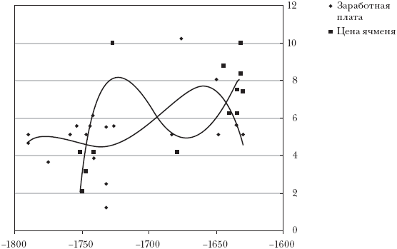 Рис. 3. Данные о заработной плате при месячном найме (в пересчете на кг в день) и цена ячменя (в сиклях за пан = 1/5 кура). Полиномиальные тренды для заработной платы (сплошная линия) и цен (прерывистая линия)[293]