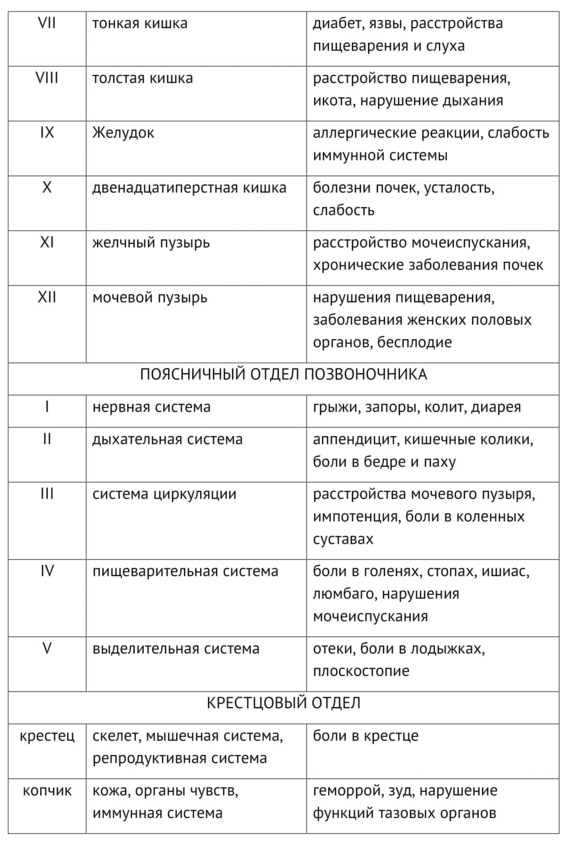 Таблица 1. Взаимосвязи между позвонками и внутренними органами (по книге Л. Ф. Васильевой, А. М. Михайлова «Мануальная диагностика и терапия дисфункции внутренних органов», Новокузнецк, 2002)