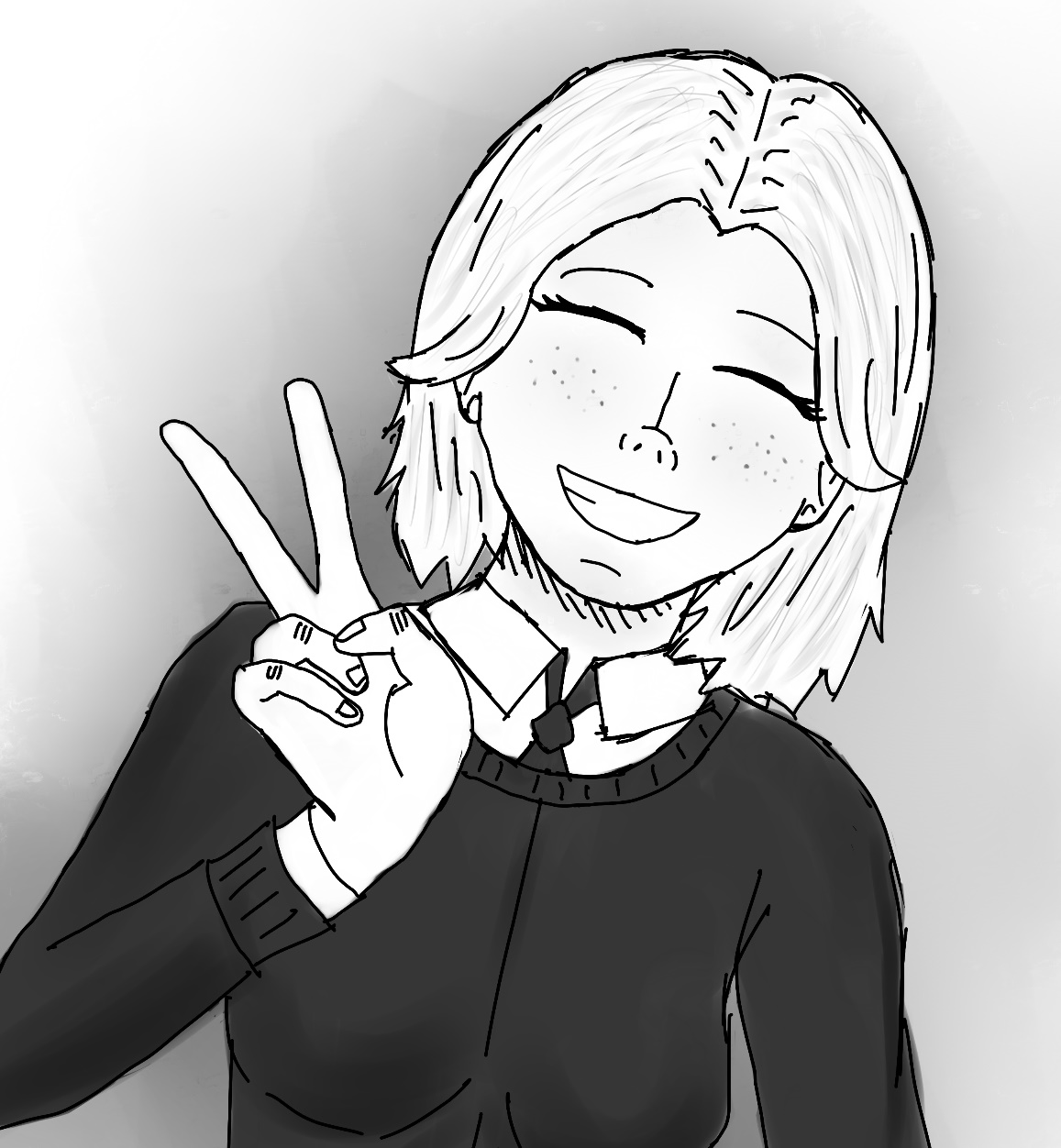 Чёлка упала на глаза, а из-под недлинных волос выглянул кончик заострённого ушка. Школьная форма в виде белой рубашки и фиолетовых пиджака, галстука и юбки лишь подчёркивали её примечательную внешность, а также природную весёлость, наивность и беззаботность.