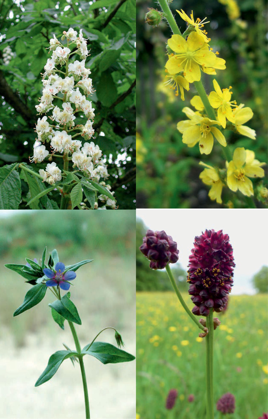 Odermennig • Hasel • Weißdorn • Wasserdost • Mädesüß • Stinkender Storchschnabel • Johanniskraut • Klatsch-Mohn • Schlehe • Hunds-Rose • Holunder • Vogelbeere • Beinwell • Brennnessel • Baldrian • März Veilchen