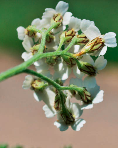 6 Bei den schmalen Blütenköpfchen handelt es sich um Teilblütenstände mit meist 5 weißen Zungenblüten am Körbchenrand, die das Aussehen von Blütenblättern einer Einzelblüte vortäuschen.