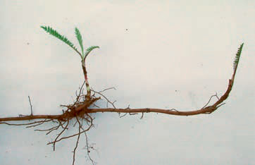 1 Die Pflanze vermehrt sich mit kriechenden Wurzelausläufern, aus denen neue Stängel treiben.