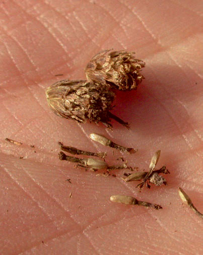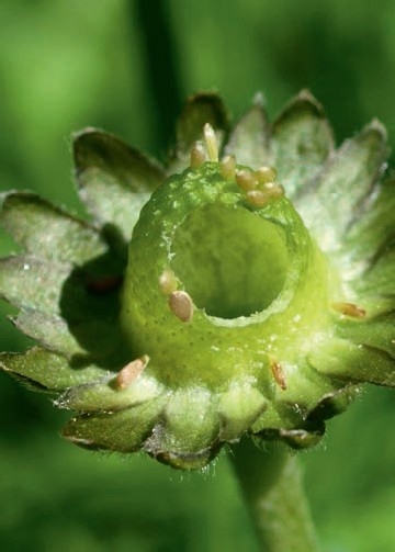 Bei den Früchten ragt meist noch der getrocknete Griffel heraus.