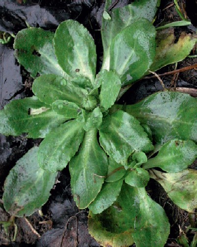 Mitten in der grundständigen Blattrosette sind die Blütenknospen noch ohne Blütenstiel.