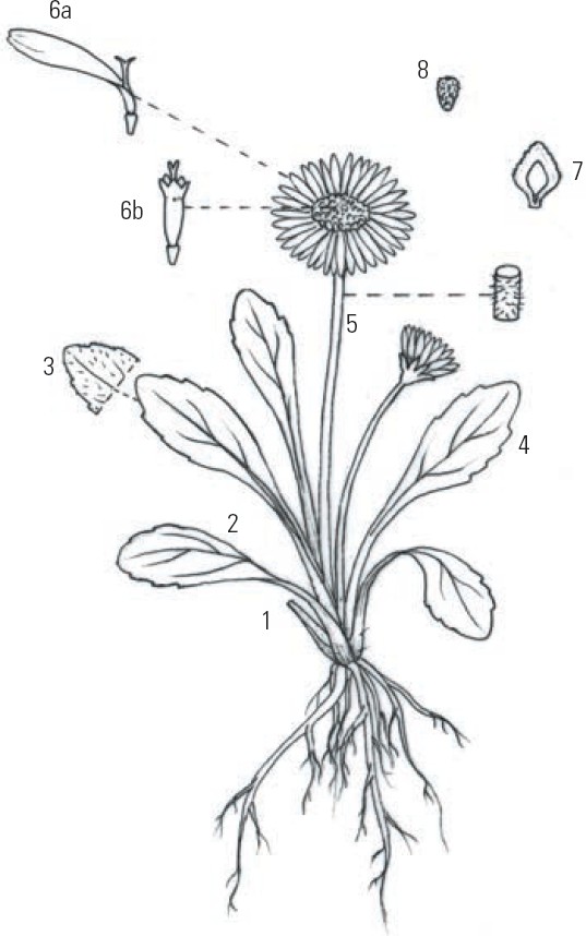 6 Zahlreiche weiße Zungenblüten (a) umgeben eine Vielzahl gelber Röhrenblüten (b).