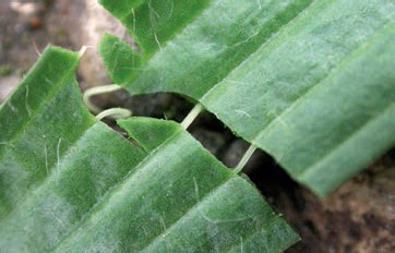 4 Die Blattnerven treten vor allem auf der Blattunterseite deutlich hervor und sind ebenso wie die Blattstiele behaart.