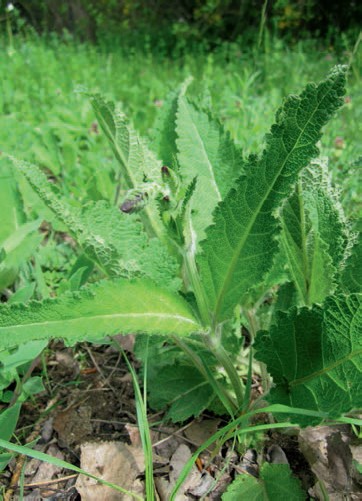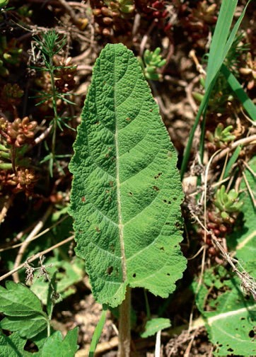 2 Vor der Blüte erscheint eine bodennahe Blattrosette mit bis zu 10 cm langen, runzligen und lang gestielten Blättern.