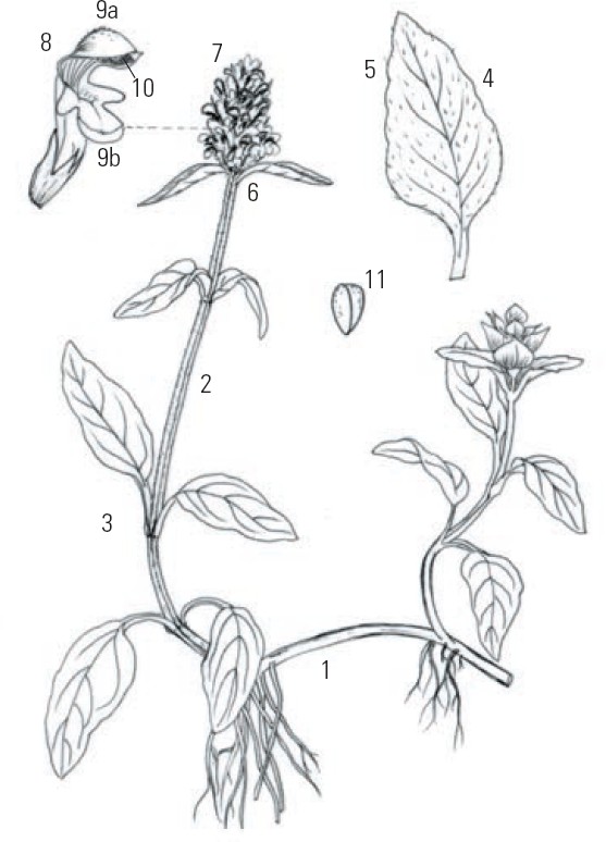 9 Die Blüten-Oberlippe ist helmförmig (a), die Unterlippe dreiteilig (b).
