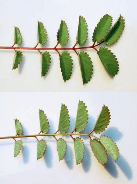 3 Das Blatt ist unpaarig gefiedert, es ist also aus einer ungeraden Anzahl an Teilblättchen zusammengesetzt. Es gibt bis zu 8 Teilblattpaare und ein ähnlich großes Endblättchen.