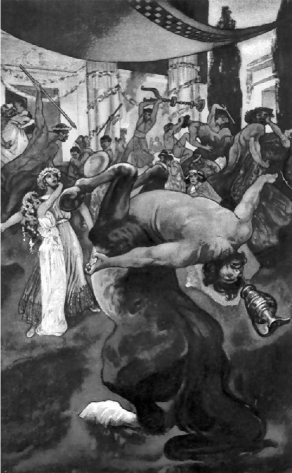 Dört bir yandan “Herkes silahlara!” diye bağrışmalar yükseldi. Bardaklar, şişeler, kâseler havada uçuyordu. Derken günahkâr canavarlardan biri komşu diyarlardan gelen adakları kaptı, bir diğeri masanın üstündeki yanmış kuzuyu parçaladı, başka biri de mağaranın duvarında asılı olan kutsal geyikle cebelleşiyordu. Korkunç kıyımlar birbirini izledi. Eurytion’dan sonra en kötü Centaur olan Rhoetus sunaktan kaptığı kızgın demiri yere düşmüş bir Lapith’in derin yarasına sapladı, bunu yapar yapmaz suya atılan kızgın bir demirin sesini andıran bir tıslama duyuldu. Hemen onun karşısında Lapithlerin en cesuru Dryas yanmakta olan bir kütüğü kaptığı gibi Rhoetus’un boynuna yapıştırdı. Sonra azılı çeteye dönerek beş tanesini yere serdi.