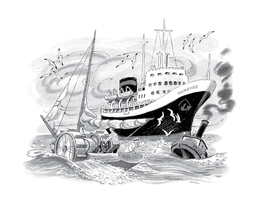 И там, где при старом способе перевозки нужен был огромный грузовой пароход с большой командой, со сложными механизмами, при новой системе может справиться любое суденышко не больше моей «Беды».