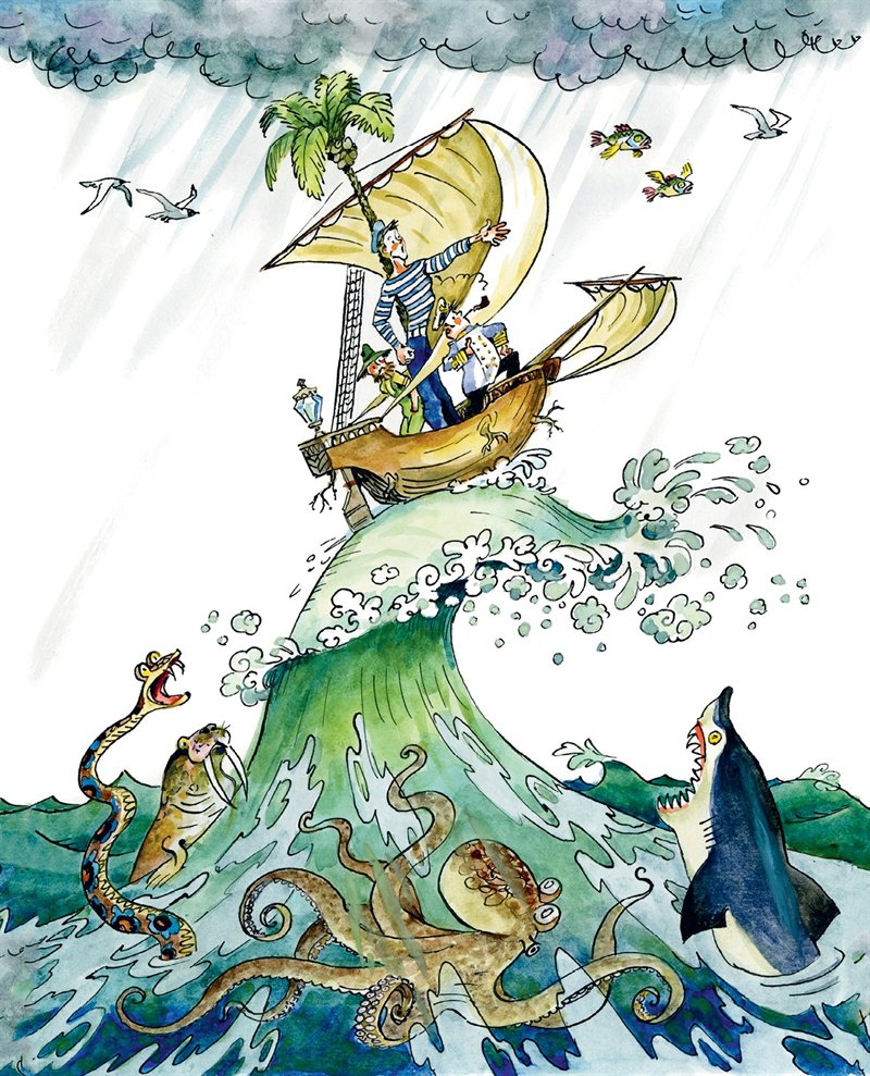 Вместо скромного отставного аптекаря за столом, углубившись в чтение какой-то древней книги, сидел грозный капитан в полной парадной форме, с золотыми нашивками на рукавах. Он свирепо грыз огромную прокуренную трубку, о пенсне и помину не было, а седые растрёпанные волосы клочьями торчали во все стороны. Даже нос, хотя он действительно и покраснел, стал у Врунгеля как-то солиднее и всеми своими движениями выражал решительность и отвагу.