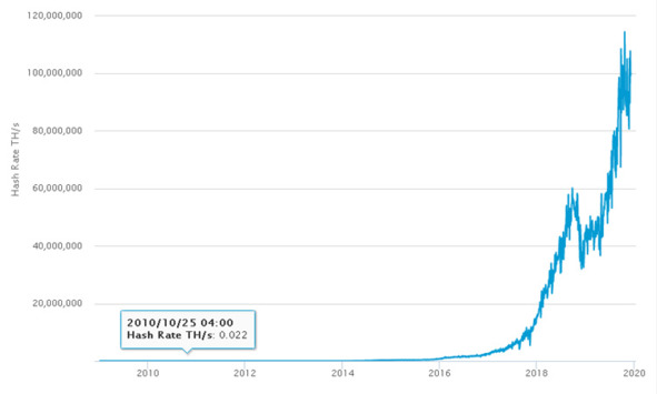 У метода PoW есть еще один очевидный недостаток: чем больше вычислительных узлов (майнеров) ищут новые блоки, тем больше увеличивается сложность добычи. То есть с подключением новых майнинговых мощностей и ростом сложности майнинга требуется потратить больше суммарного машинного времени и электроэнергии для достижения того же результата – нахождения нового блока. В результате конкуренции объем вычислительных мощностей (хэшрейт), занятых майнигом биткойна, начинает стремительно расти.