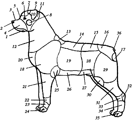 Статями называются отдельные части тела собаки, имеющие важное значение при оценке ее экстерьера и рабочих качеств. На рисунке ниже приведена схема, по которой легко сориентироваться при определении тех или иных достоинств, недостатков, пороков и отклонений от нормы у представителей данной породы.