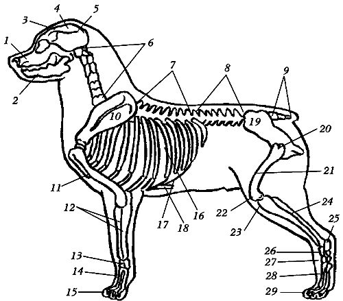 Скелет собаки выполняет опорную функцию, а также защищает внутренние органы от внешних повреждений. Он состоит из костей, соединенных между собой непрерывно (сращенные) или прерывисто (с помощью суставов).