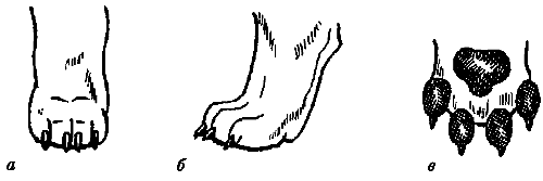 Лапы задних конечностей большие и округлые. На них расположено по четыре пальца.