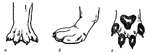 Подушечки лап должны быть плотными и пружинистыми, а когти крепкими, равномерно сточенными, направлеными вниз. Если пальцы слишком далеко расположены друг от друга, это отрицательно влияет на способность лапы пружинить при соприкосновении с землей. На лапах передних конечностей расположено по пять пальцев, которые не должны быть выпрямленными.