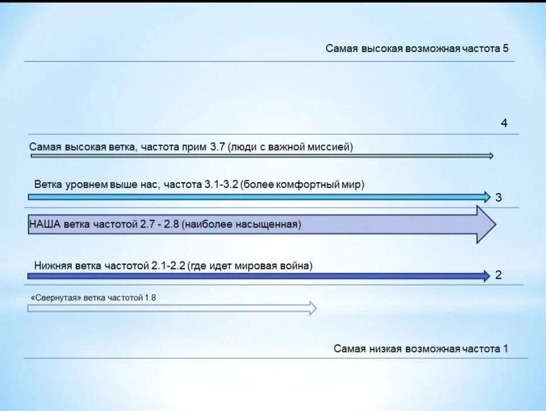 3. Непосредственно наша ветка проходит на частоте 2.7–2.8, но при этом имеет тенденцию к повышению частоты. Из всех существующих веток она является самой густонаселенной. В нашей ветке и ее дублерах сосредоточено внимание порядка 60–70 процентов всех Душ, находящихся на Земле.
