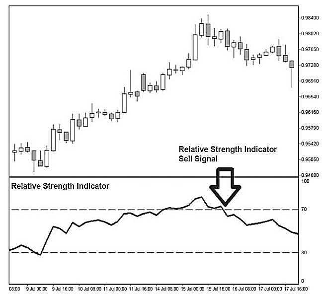 Рисунок 2.1. Традиционный сигнал RSI на продажу на четырехчасовом графике валютной пары AUD/USD.