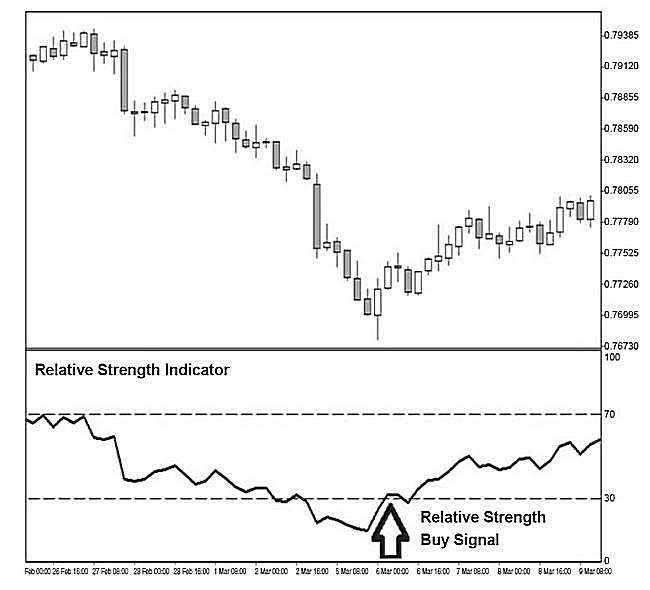 Рисунок 2.2. Традиционный сигнал RSI на покупку на четырехчасовом графике валютной пары AUD/USD.
