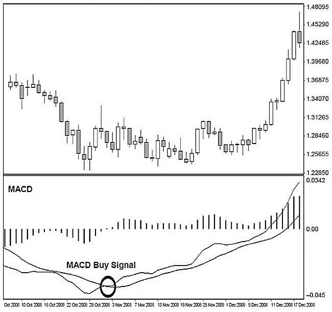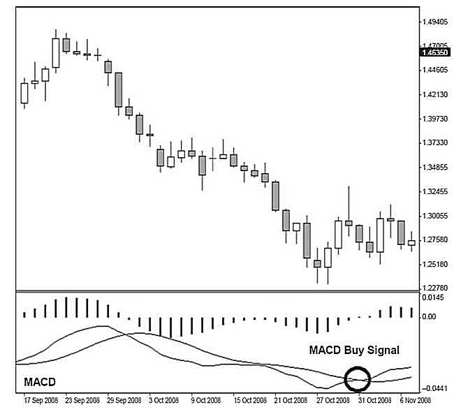 Рассмотрим еще один случай на материале дневного графика валютной пары EUR/USD (Рис. 2.3). В нижней части графика выведен индикатор MACD (Moving Average Convergence Divergence – схождение-расхождение скользящей средней). На принципе расчета и теории применения MACD мы не будем останавливаться, они не столь важны. Этот индикатор состоит из нескольких скользящих средних линий. Сигнал по MACD возникает при пересечении двух скользящих средних (см. темный круг на Рис. 2.3). Традиционный сигнал на покупку формируется тогда, когда после спуска линия разворачивается и начинает подъем, а более быстрая скользящая средняя пересекается с более медленной линией.