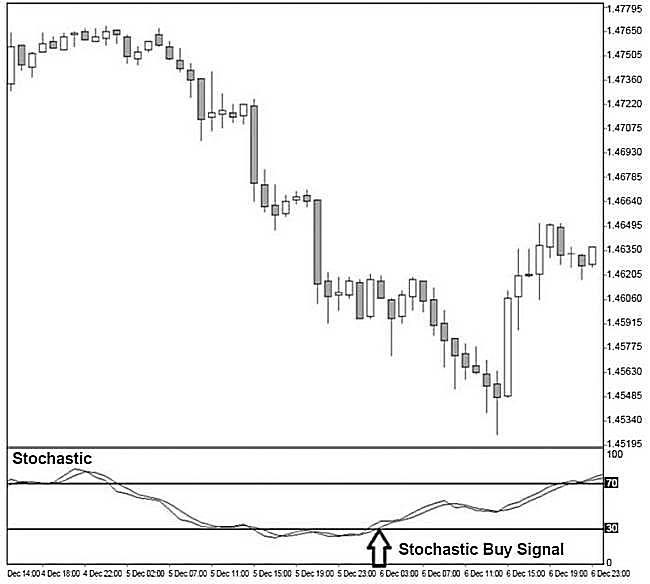 MACD и RSI – не единственные индикаторы, которые запаздывают. На самом деле от цены отстают все индикаторы. Стохастик является популярным среди трейдеров индикатором, который используют для выстраиваемых с учетом фактора времени сделок, соответствующих колебаниям естественного ритма рынка. Один из традиционных методов торговли по стохастикам схож со стратегиями индекса RSI. Сигнал на покупку генерируется, когда после падения ниже уровня 30 линии стохастиков пересекаются и идут вверх (см. Рис. 2.5).