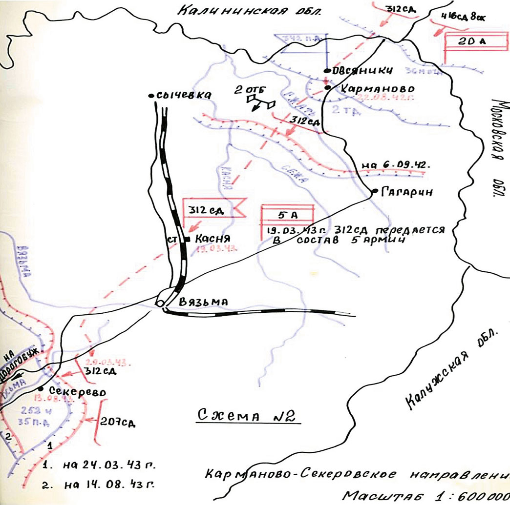 Из «Истории боевого пути 312-й Смоленской, Краснознаменной, орденов Суворова и Кутузова стрелковой дивизии». По схеме видно, что дивизия освобождала родину Ю. А. Гагарина. А до переформирования, в 1941, дивизия стояла насмерть на подступах к Москве, рядом с Подольскими курсантами