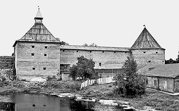 А по переписным книгам XVII столетия здесь значится вторая крепость Ладоги, срубленная из дерева. Она окружала городище деревянными стенами с тремя башнями – Воротной, Наугольной и Бережной. Внутри этой крепости находились в то время разные административные учреждения. В Книге перечислены: церковь Климента каменная, церковь Спаса деревянная, двор воеводы и зелейная казна (пороховой погреб).
