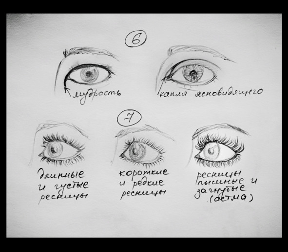 Неотъемлемой частью глаз являются ресницы. видно, что ресницы могут быть густыми и редкими, при этом короткие либо длинные. У всех эти показатели разные, поэтому на практике всматривайтесь. Длина ресниц сообщает об уровне чувственности. Можно ли удивить чем-то человека, насколько он восприимчив к увиденному. Густота ресниц сообщает о стрессоустойчивости. Если ресницы редкие, то такой человек мнительный. В пункте 7