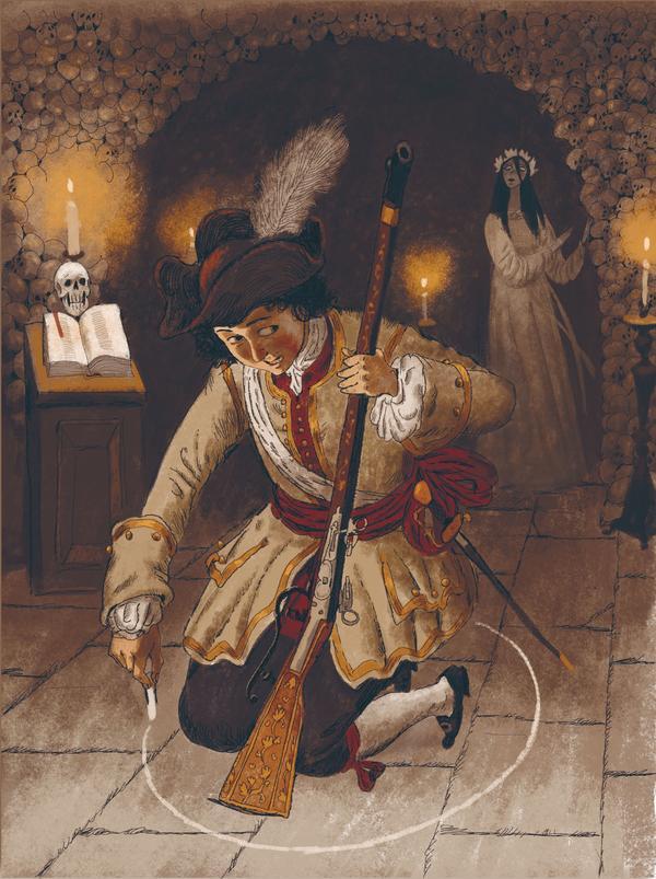Простился с товарищами и прошёл через темную церковь к освещённому королевскому склепу. Там Богумил взял одну из двадцати четырёх зажжённых свечей, что стояли вокруг гроба, и посветил по всем углам. Нигде ничего. Тогда Богумил встал посреди склепа, нарисовал круг, шагнул в него, сжал покрепче оружие и стал ждать, что будет. Иногда делалось ему тоскливо, но он напомнит себе слова старика – и страха как не бывало. Пробило одиннадцать. Золотая крышка на гробе принцессы сдвинулась, сама она, вся чёрная, поднялась из гроба и стала летать по склепу, словно ведьма. Она хотела наброситься на солдата, но не смела пересечь круг. В дикой ярости принялась она срывать крышки с гробов и выбрасывать оттуда истлевших мертвецов. Так принцесса лютовала до двенадцати. Ровно в полночь бросилась она в свою мрачную постель, крышка закрылась, и всё стихло. И хотя у Богумила хватило мужества перенести всё, что творилось в склепе, он обрадовался, заслышав шаги сменщиков. Солдаты немало удивились и обрадовались, застав товарища невредимым, и хотели дознаться, что он видел.