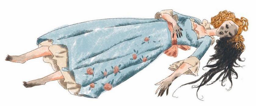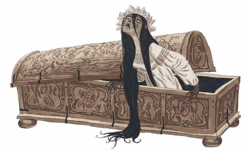 Только мать хотела побранить дочку за мрачные мысли, как девушка почернела, словно уголь, и повалилась на пол бездыханной. Королева упала без чувств, король рвал на себе волосы, созвали полную залу лекарей – но никто не сумел воскресить бедную девушку. Принцессу нарядили в дорогие одежды, положили в золотой гроб и похоронили в королевской усыпальнице. Король повелел, чтобы день и ночь около гроба стоял караул. Вся страна скорбела о доброй принцессе, а больше всех убивались несчастные родители – жизнь стала им не в радость.